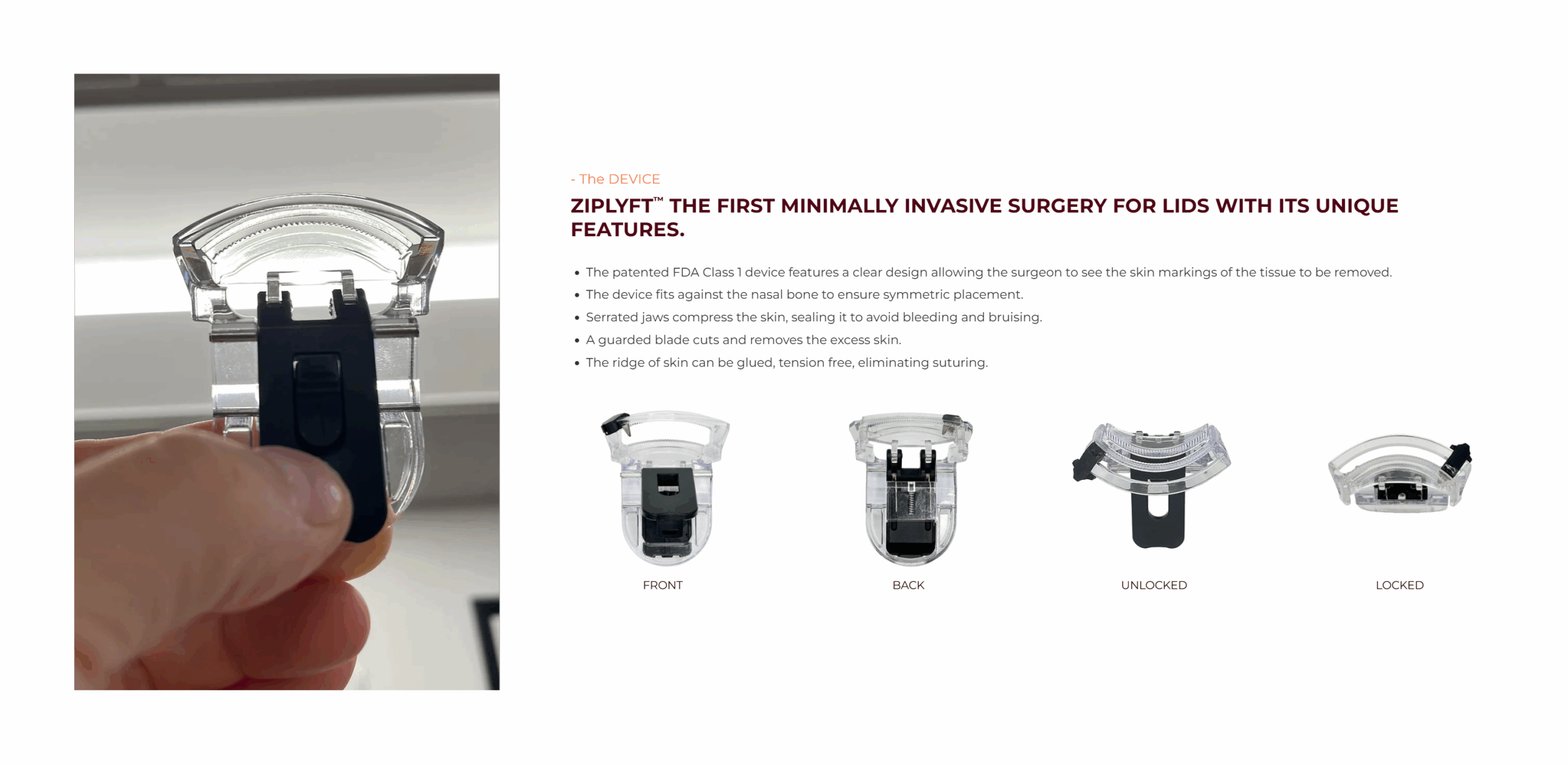 As the first device in this emerging category, Ziplyft redefines how physicians approach skin excision and rejuvenation. The CoCo technique has broad potential applications beyond the upper eyelid, including the lower eyelid, brow, jowl, chin, and underarm, opening the door to an entirely new class of minimally invasive aesthetic treatments.